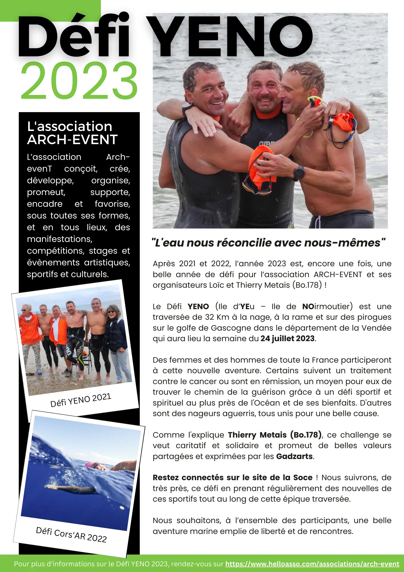 Le Défi YENO (Ile d'YEu - Ile de NOirmoutier) est une traversée de 32 kilomètres à la nage, à la rame et sur des pirogues sur le golfe de Gascogne dans le département de la Vendée qui aura lieu la semaine du 24 juillet 2023.
