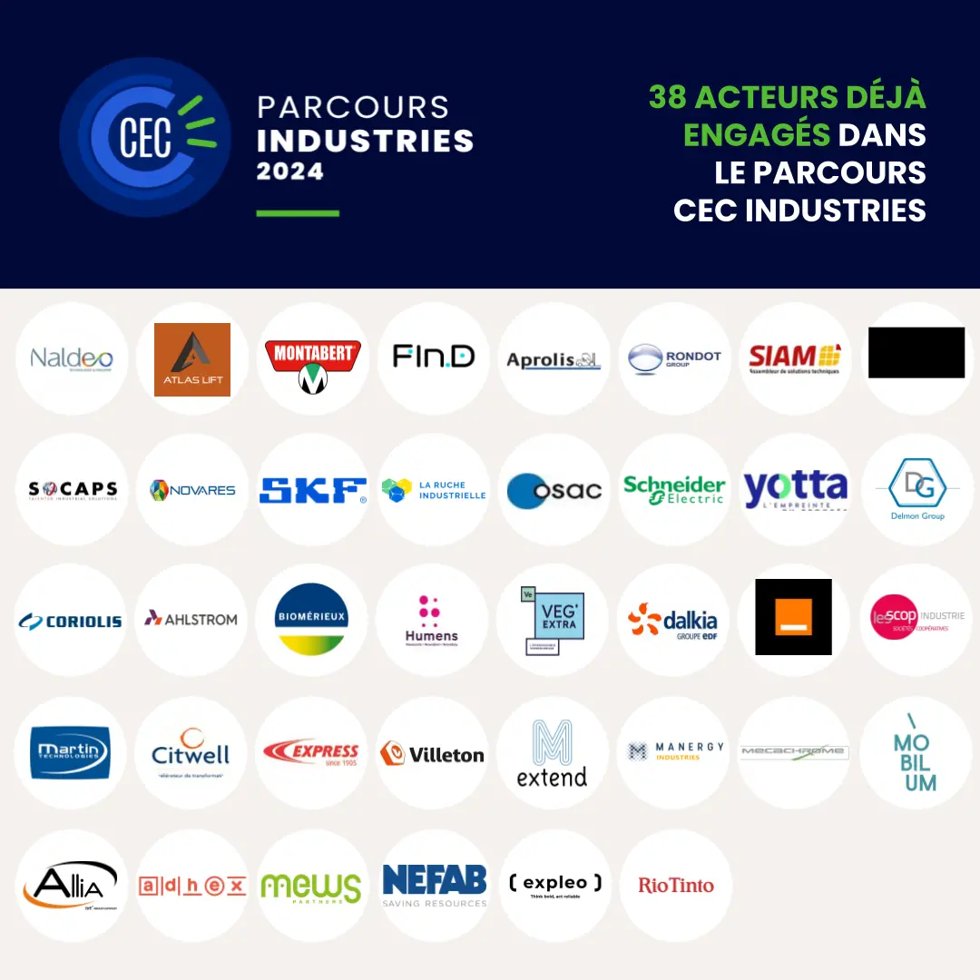 Le recrutement des entreprises pour le parcours CEC Industries se poursuit activement et déjà 38 acteurs engagés, parmi eux : Rio Tinto Aluminium Pechiney, Humens, BioMérieux, Find Climate, la fédération des scop et scic de l’industrie, Coriolis Composites, Martin Technologies…