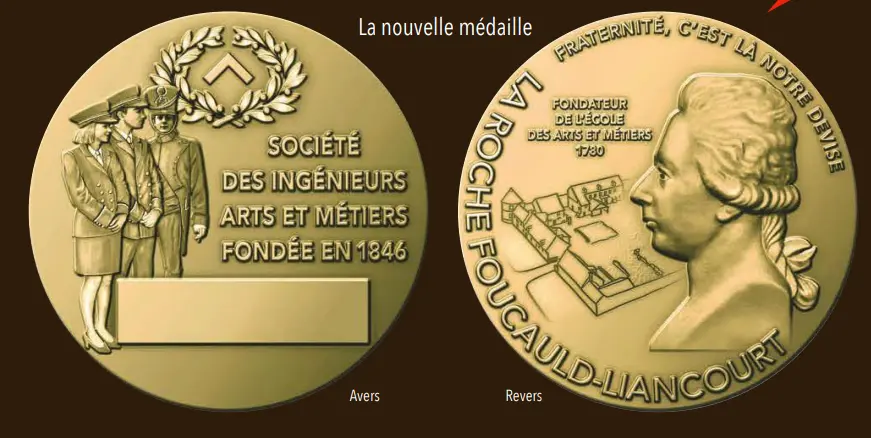 - sur la forme : une optimisation du dessin des gadzarts jugés trop “raides” sur l’ancienne médaille, ainsi que celui du buste du duc de La Rochefoucauld-Liancourt (un peu tronqué sur la médaille actuelle)