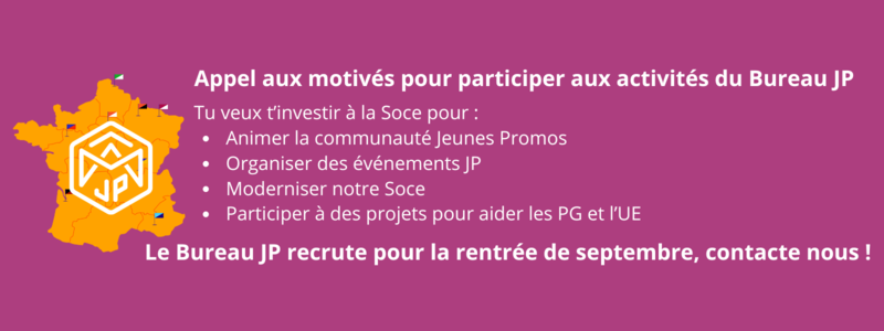 Le Bureau JP est en charge d’animer la communauté et de porter la voix des Jeunes Promotions au sein de la Soce. Pour rappel, les JP sont les Gadzarts qui sont sortis il y a moins de 10 ans de l’école !