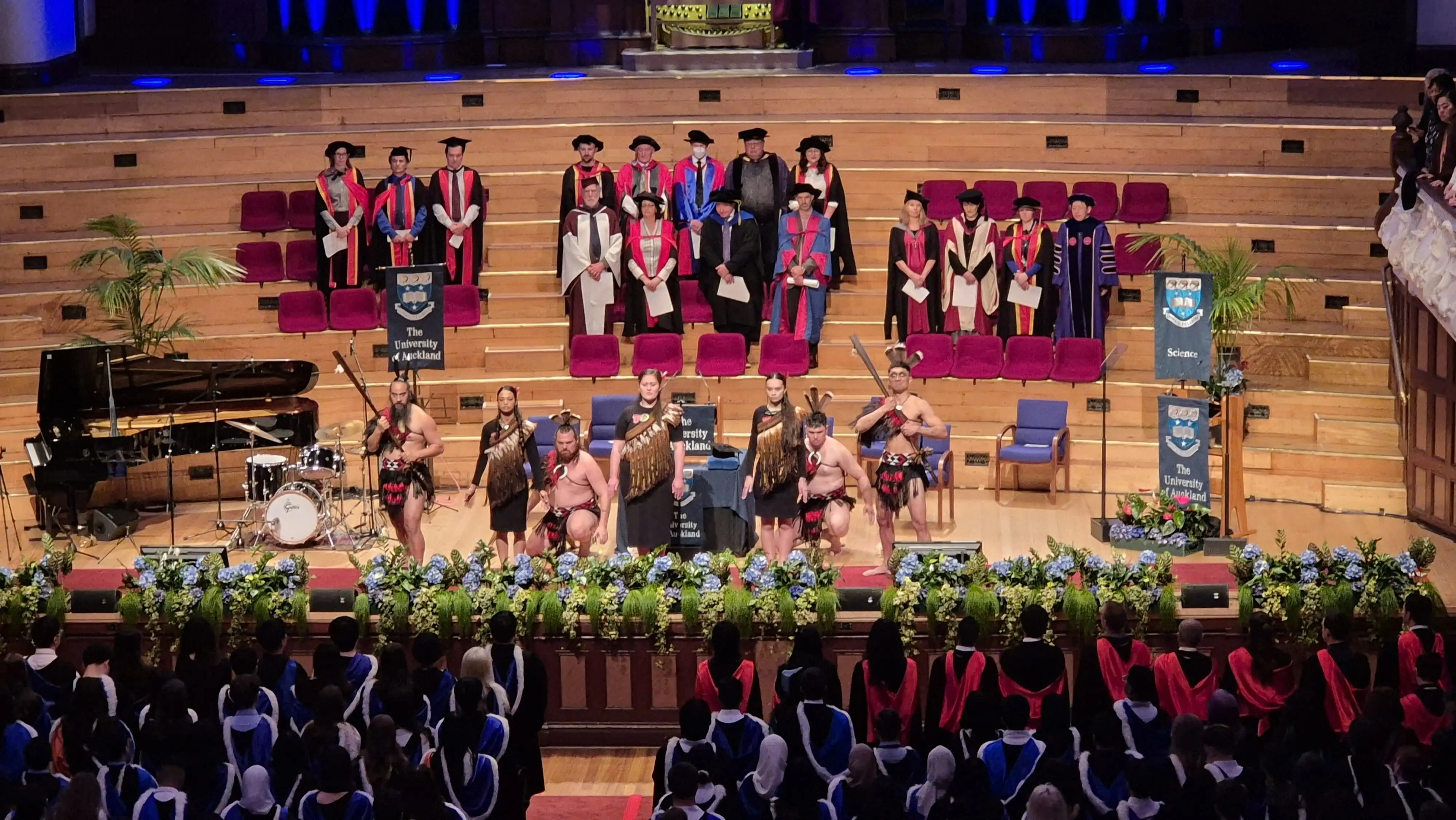 Lors de la cérémonie de remise des diplômes à l’Université d’Auckland, Adèle et Paul ont assisté à un moment d’une grande intensité : l’ouverture par un haka et un waiata, suivie, à la clôture, de l’hymne national chanté par toute l’assemblée. Ce moment puissant symbolise la fusion entre la culture maorie et la culture nationale néo-zélandaise.